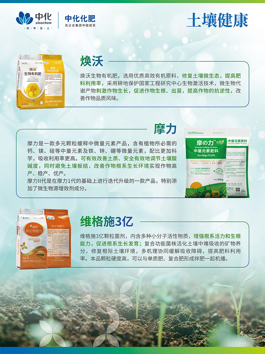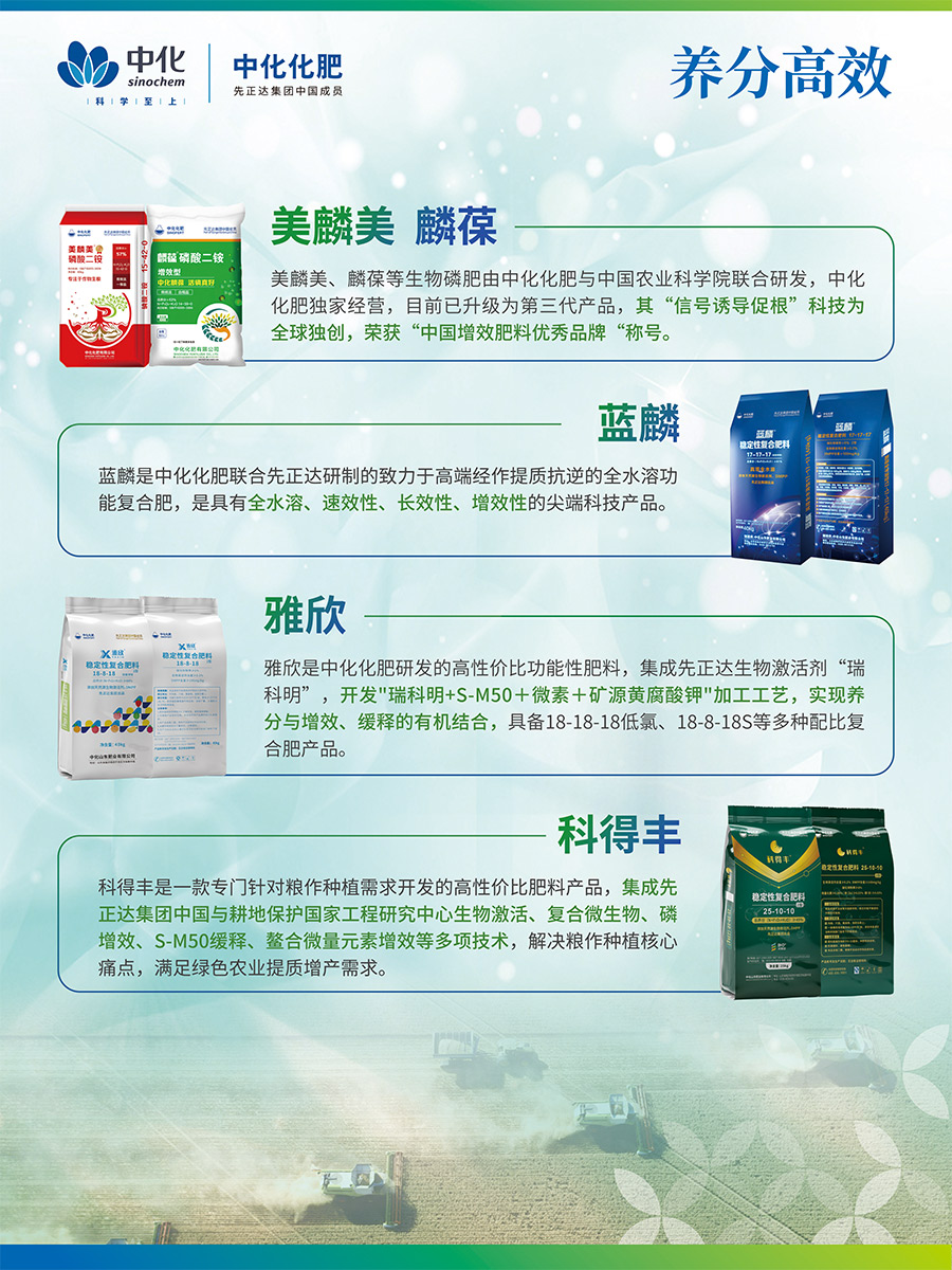 美麟美、麟葆等生物磷肥由中化化肥與中國農業(yè)科學院聯(lián)合研發(fā),中化化肥獨家經營,目前已升級為第三代產品,其“信號誘導促根”科技為全球獨創(chuàng),榮獲“中國增效肥料優(yōu)秀品牌“稱號藍麟是中化化肥聯(lián)合先正達研制的致力于高端經作提質抗逆的全水溶功能復合肥,是具有全水溶、速效性、長效性、增效性的尖端科技產品。