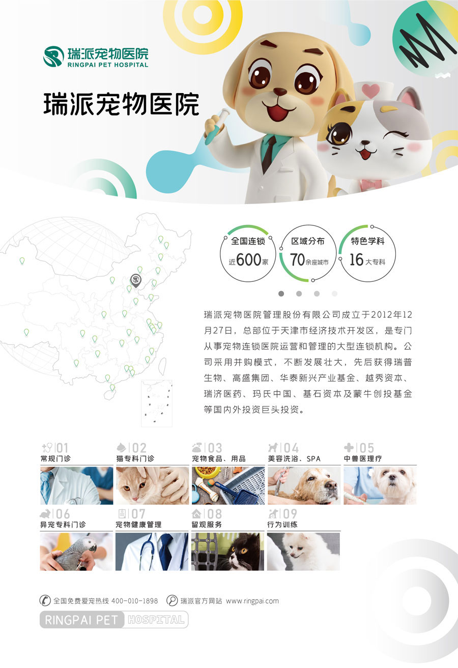 瑞派寵物醫(yī)院管理股份有限公司成立于2012年12月27日,總部位于天津市經(jīng)濟技術(shù)開發(fā)區(qū),是專門從事寵物連鎖醫(yī)院運營和管理的大型連鎖機構(gòu)。公司采用并購模式,不斷發(fā)展壯大,先后獲得瑞普生物、高盛集團、華泰新興產(chǎn)業(yè)基金、越秀資本、瑞濟醫(yī)藥、瑪氏中國、基石資本及蒙牛創(chuàng)投基金等國內(nèi)外投資巨頭投資。