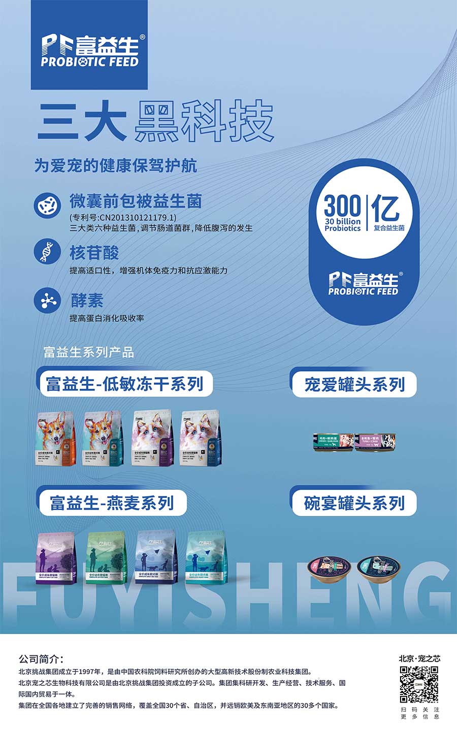 北京挑戰(zhàn)集團(tuán)將科技創(chuàng)新視為企業(yè)生命的源泉,組建挑戰(zhàn)研究院,其中博士生導(dǎo)師3人,博士14人,碩士40余人,擁有國(guó)家級(jí)“生物飼料開發(fā)國(guó)家工程研究中心”“院士專家工作站”和“企業(yè)博士后流動(dòng)站”各一個(gè)。至今獲取專利授權(quán)31件,主持承擔(dān)國(guó)家和行業(yè)研發(fā)項(xiàng)目共23項(xiàng)。挑戰(zhàn)集團(tuán)研究院院長(zhǎng)張廣民博士帶領(lǐng)寵物食品研發(fā)團(tuán)隊(duì)經(jīng)過(guò)多年的研究與試驗(yàn)成功將全價(jià)寵物干糧與多種益生菌及酶制劑完美的結(jié)合-富益生全價(jià)寵物食品。通過(guò)添加挑戰(zhàn)集團(tuán)自主產(chǎn)品“微囊前包被益生菌”“核苷酸”及酶制劑使富益生產(chǎn)品獲得了強(qiáng)大的產(chǎn)品優(yōu)勢(shì)。
