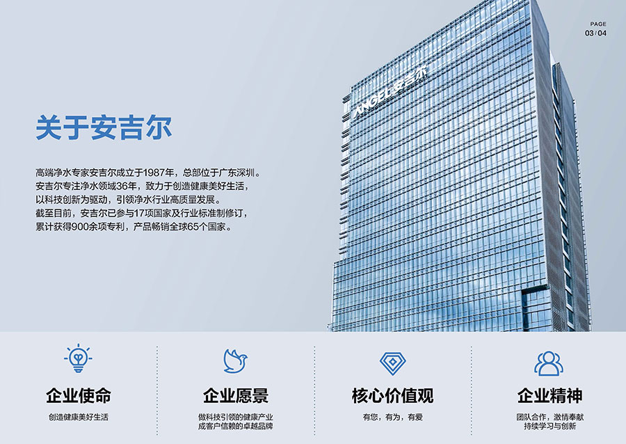 安吉爾成立于1987年,總部設(shè)立于廣東深圳。該品牌深耕凈水領(lǐng)域38年,其專業(yè)凈水器產(chǎn)品銷量持續(xù)領(lǐng)先。目前該企業(yè)已構(gòu)建超10000家渠道門店網(wǎng)絡(luò),其中包含近2000家專賣店,產(chǎn)品暢銷全球65個國家,累計服務(wù)超500萬活躍用戶。