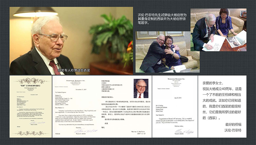 大楊集團(tuán)堅(jiān)持做民族品牌,揚(yáng)國(guó)人志氣,致力打造國(guó)際一流服裝品牌。上世紀(jì)90年代創(chuàng)立了第一個(gè)自主品牌——TRANDS(創(chuàng)世),先后榮獲“中國(guó)出口名牌”、“中國(guó)名牌產(chǎn)品”等稱號(hào),并獲得中國(guó)服裝協(xié)會(huì)頒發(fā)的中國(guó)服裝品牌品質(zhì)大獎(jiǎng),成為當(dāng)今中國(guó)高級(jí)男裝的領(lǐng)軍品牌之一。TRANDS(創(chuàng)世)品牌申報(bào)國(guó)家非遺創(chuàng)新產(chǎn)品的“‘龍’金絲蘇繡中式華服”被授予十大類紡織創(chuàng)新產(chǎn)品。“股神”沃倫·巴菲特、微軟主席比爾·蓋茨、世界經(jīng)濟(jì)論壇主席克勞斯·施瓦布等國(guó)際精英人士,均已成為品牌的忠實(shí)客戶。目前,大楊集團(tuán)已形成以高級(jí)男裝品牌TRANDS(創(chuàng)世)為龍頭,團(tuán)體定制高級(jí)商務(wù)裝品牌KEYMEN(凱門)、高級(jí)定制品牌凱門定制、網(wǎng)上直銷品牌YOUSOKU(優(yōu)·搜·酷)、學(xué)生裝品牌KEYMEN KIDS等組成的自主品牌梯隊(duì)。