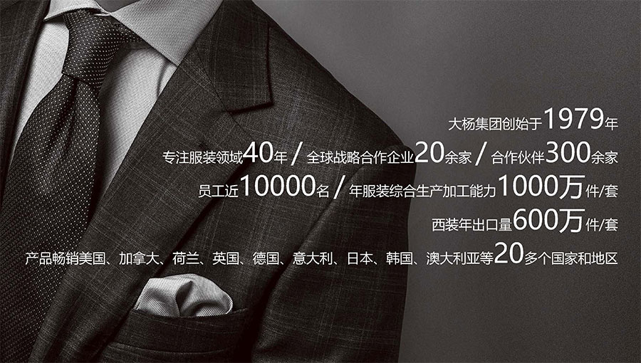 大楊集團(tuán)創(chuàng)建于1979年,總部位于遼寧省大連市,主要生產(chǎn)和銷售各類中高檔服裝產(chǎn)品為主的國(guó)際化大型服裝企業(yè),以西裝縫制享譽(yù)全球,是世界重要的西裝生產(chǎn)加工基地?,F(xiàn)有直屬(控股)成員企業(yè)20家,員工4500人。控股子公司大連大楊創(chuàng)世股份有限公司2000年在上海證券交易所上市,并于2016年完成重大資產(chǎn)重組。