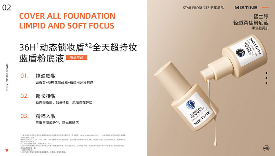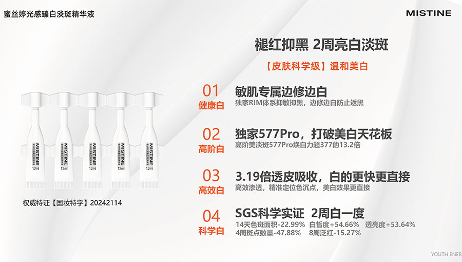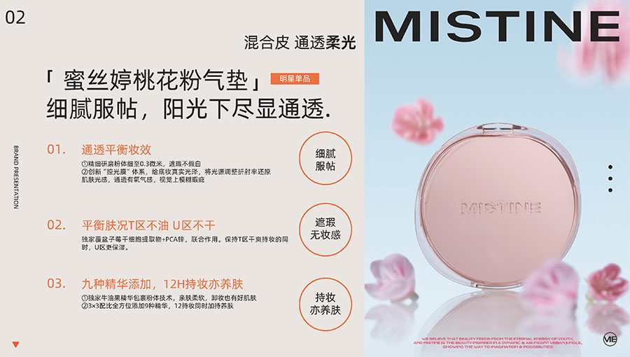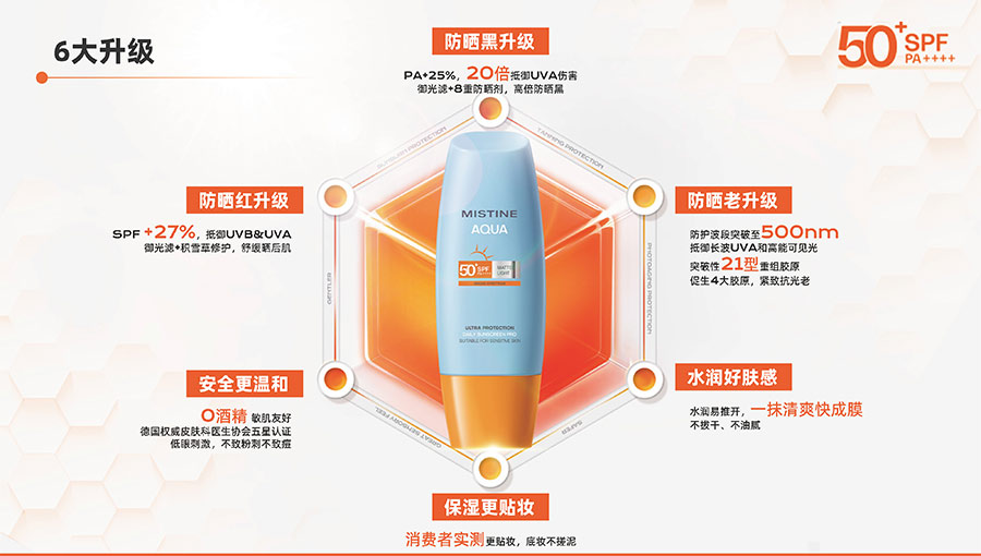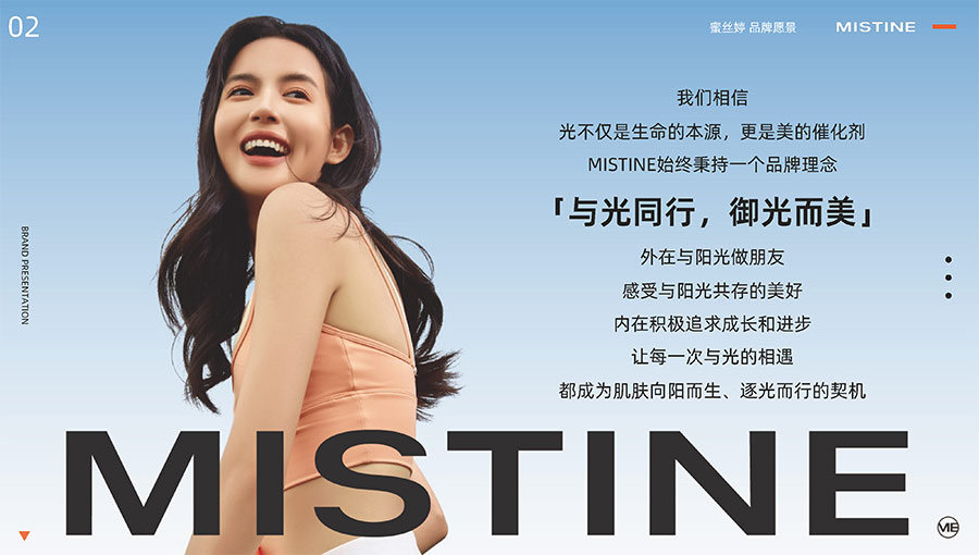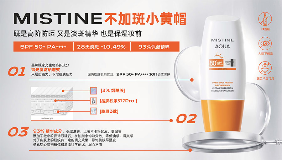 MISTINE蜜絲婷提出皮膚科學(xué)、前沿科技、靈魂成分、熱帶美學(xué)、卓越功效、保護(hù)環(huán)境六大品牌價(jià)值,致力于為全球女性提供豐富、安全、高品質(zhì)的美妝產(chǎn)品?;贛ISTINE蜜絲婷品牌首席顧問(wèn)——全球計(jì)算生物學(xué)權(quán)威之一、諾貝爾化學(xué)獎(jiǎng)得主Arieh Warshel的研究,MISTINE創(chuàng)新防曬品類推出「光生物學(xué)」防曬系統(tǒng),提出“外層防護(hù)、中層修護(hù)和底層抗損”防曬新理念,引領(lǐng)防曬從“表面防護(hù)”進(jìn)入“深度抗光老”新時(shí)代。同時(shí),MISTINE蜜絲婷還持續(xù)深耕專業(yè)彩妝市場(chǎng),以熱帶美學(xué)基因造就產(chǎn)品防水防汗、高倍耐曬、長(zhǎng)效持妝的優(yōu)勢(shì),圍繞消費(fèi)者需求打造多元化的產(chǎn)品矩陣,引領(lǐng)防曬、底妝賽道發(fā)展。