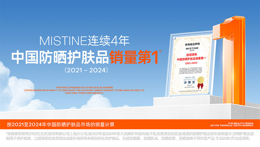 歷經(jīng)37年的科研沉淀,MISTINE蜜絲婷品牌在防曬、護(hù)膚、底妝、彩妝多個(gè)品類的產(chǎn)品開(kāi)發(fā)中,堅(jiān)持圍繞對(duì)“光”的研究,在光與防曬護(hù)膚、光與色彩妝容的產(chǎn)品應(yīng)用層面,研究光、理解光、樂(lè)享光,持續(xù)不斷地提供產(chǎn)品解決方案,滿足消費(fèi)者對(duì)防曬美白、潮流妝容、護(hù)膚健康的需求。防曬系列產(chǎn)品作為MISTINE蜜絲婷的知名品類,以物化生一體的全鏈路防曬技術(shù),憑借高倍防曬、清爽膚感的高功效和高質(zhì)價(jià)比勝出,自2021年連續(xù)三年位于中國(guó)防曬護(hù)膚品銷量領(lǐng)先。