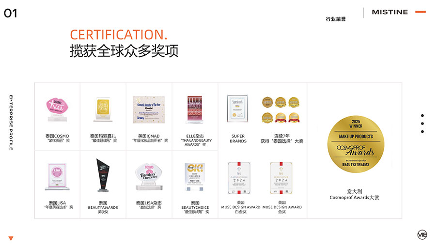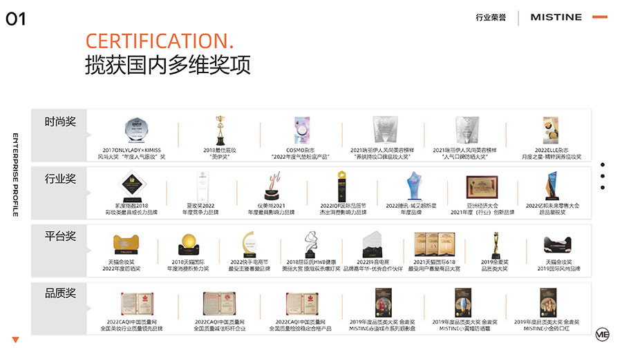 37年來(lái),MISTINE蜜絲婷步履不停,堅(jiān)持從消費(fèi)者出發(fā),以優(yōu)質(zhì)專研產(chǎn)品、適時(shí)而動(dòng)的渠道策略和持續(xù)發(fā)力的品牌塑造,贏得眾多消費(fèi)者的喜愛(ài)和行業(yè)內(nèi)外的贊許。迄今,MISTINE蜜絲婷已連續(xù)七年攬獲“泰國(guó)選擇”大獎(jiǎng),同時(shí)先后榮獲中國(guó)化妝品大會(huì)藍(lán)玫獎(jiǎng)「年度競(jìng)爭(zhēng)力品牌」、IQF國(guó)際品質(zhì)節(jié)暨消費(fèi)領(lǐng)導(dǎo)力峰會(huì)「杰出消費(fèi)影響力品牌」、CAQI中國(guó)質(zhì)量網(wǎng)「全國(guó)美妝行業(yè)質(zhì)量領(lǐng)先品牌」、天貓金妝獎(jiǎng)超級(jí)單品「年度防曬獎(jiǎng)」、凱度消費(fèi)者指數(shù)「極具成長(zhǎng)力品牌」等榮譽(yù)。
