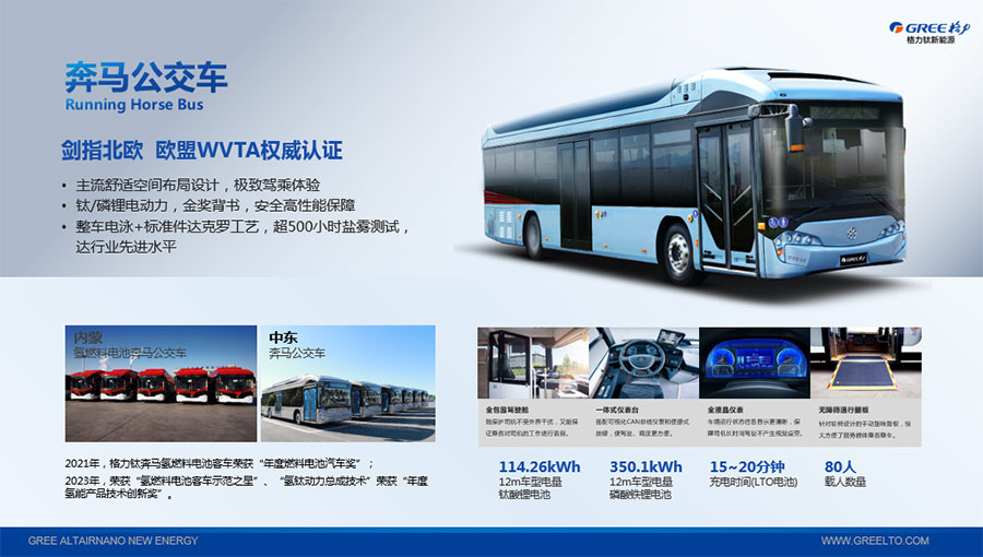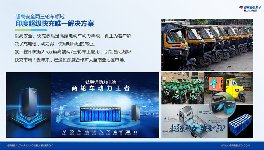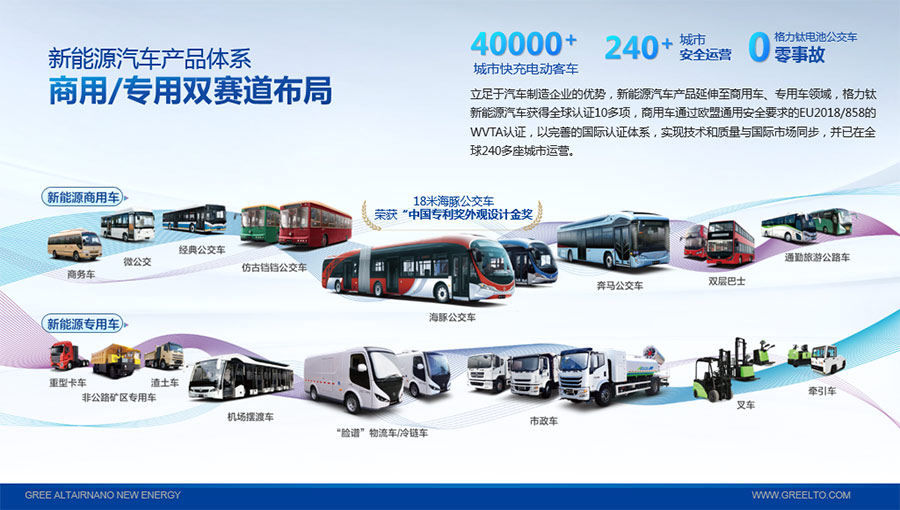 以完善的研發(fā)體系,格力鈦加快技術(shù)創(chuàng)新與產(chǎn)業(yè)升級的步伐。格力鈦研發(fā)的格力鈦電池安全性長期領(lǐng)跑行業(yè),憑借具有高安全、大倍率、快充放、耐寬溫、長壽命等特性,被選為“國家制造業(yè)單項冠軍產(chǎn)品”,廣泛應(yīng)用于新能源汽車以及工商業(yè)園區(qū)、通訊基站、電網(wǎng)調(diào)頻、軌道交通、風(fēng)光消納、船舶岸電、家庭住宅、軍事科研等儲能領(lǐng)域,具有廣闊的市場前景和應(yīng)用價值。目前,格力鈦儲能產(chǎn)品已在丹麥、瑞士、芬蘭等全球30多個國家和地區(qū)使用,新能源汽車產(chǎn)品在北京、杭州、武漢、成都、青島、哈爾濱、包頭、??诘热?40多座城市運營,12年全球零電池事故安全運行。