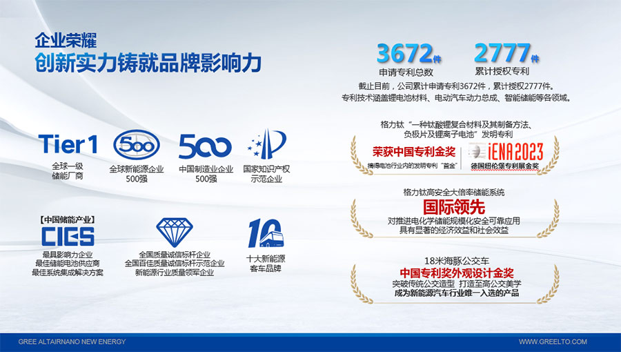 2022年,“一種鈦酸鋰復(fù)合材料及其制備方法、負極片及鋰離子電池”發(fā)明專利獲得中國專利金獎,摘得鋰電池行業(yè)內(nèi)的發(fā)明專利“首金”;2023年,該專利技術(shù)再次斬獲第75屆德國紐倫堡發(fā)明國際金獎。“高安全大倍率儲能系統(tǒng)關(guān)鍵技術(shù)研發(fā)與應(yīng)用”項目被中國機械工業(yè)聯(lián)合會鑒定達到“國際領(lǐng)先”水平。截至目前,格力鈦先后獲得“中國民營企業(yè)制造業(yè)500強”、“全國質(zhì)量信得過產(chǎn)品”、“客車安全技術(shù)成果獎”、“中國儲能產(chǎn)業(yè)最具影響力企業(yè)獎、最佳系統(tǒng)集成商、最佳儲能電池供應(yīng)商”等榮譽,獲得工信部頒發(fā)的“綠色工廠”榮譽稱號;上榜科技部發(fā)布的新能源領(lǐng)域獨角獸企業(yè),多年入選全球新能源企業(yè)500強,入選“全國百佳質(zhì)量檢驗誠信標(biāo)桿企業(yè)”、“國家知識產(chǎn)權(quán)優(yōu)勢企業(yè)”等。