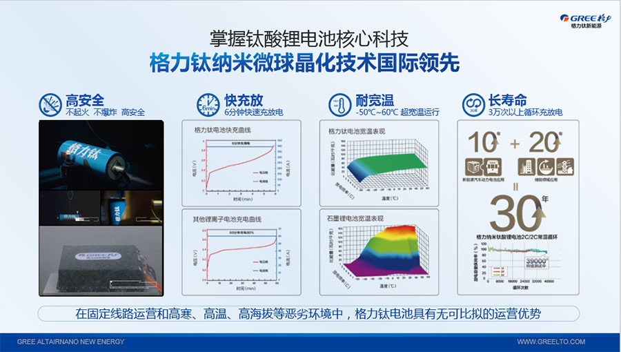 鈦酸鋰電池技術(shù)是新能源行業(yè)唯一獲得中國專利獎金獎的鋰電池產(chǎn)品技術(shù),其應(yīng)用于儲能電池和動力電池具有超高安全性,在快充放、耐寬溫、長壽命等方面同樣具有卓越的性能。格力鈦電池系列產(chǎn)品具有不起火不爆炸高安全、6分鐘快充放、-50℃至60℃耐寬溫特性,循環(huán)充放電次數(shù)高達30000多次,使用壽命長達30年。格力鈦電池經(jīng)利鋸切割、尖針穿刺、強力擠壓、電鉆沖孔、短路充放電、高溫加熱、槍擊等極限條件測試,均未發(fā)生冒煙、起火、燃燒、爆炸等現(xiàn)象。