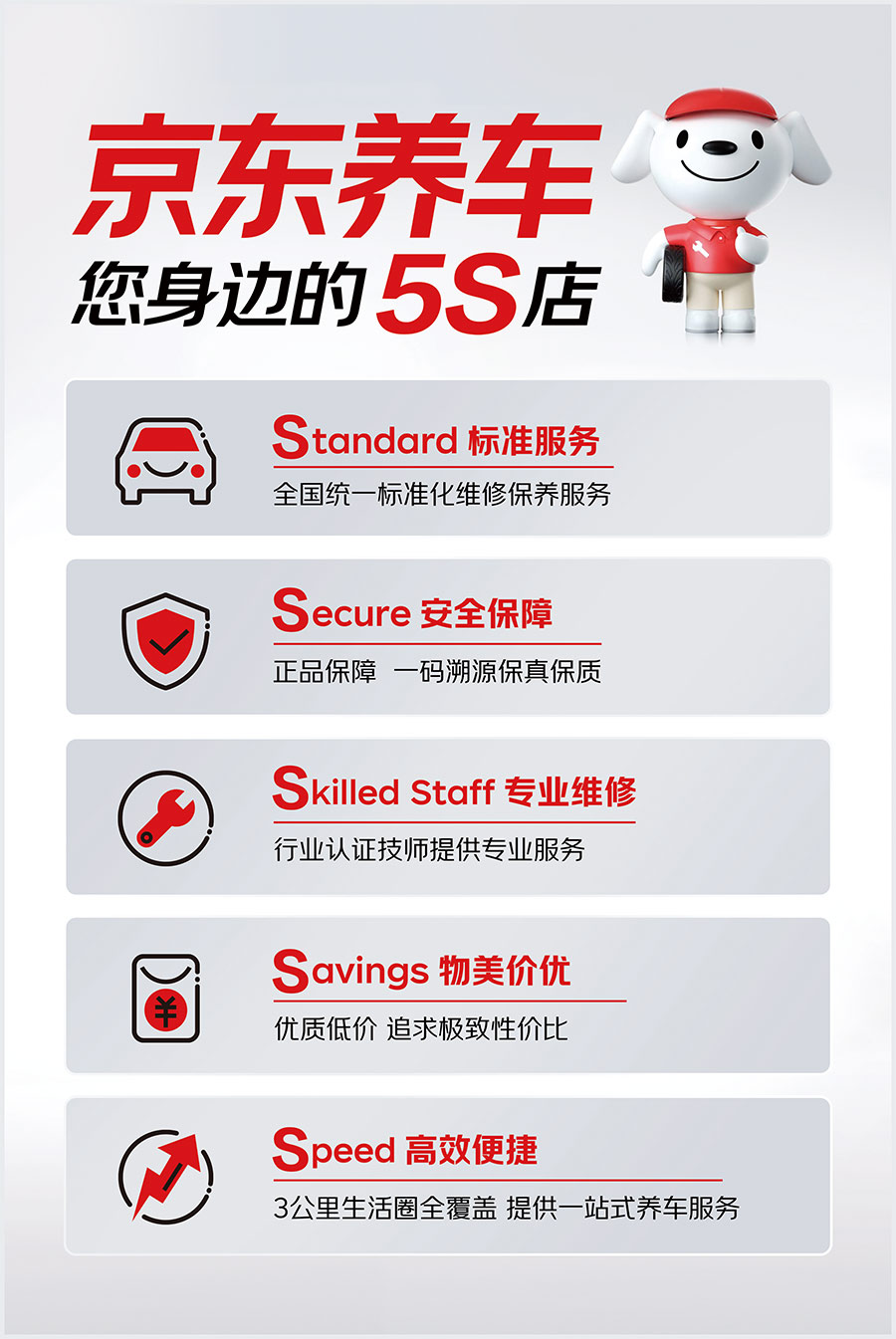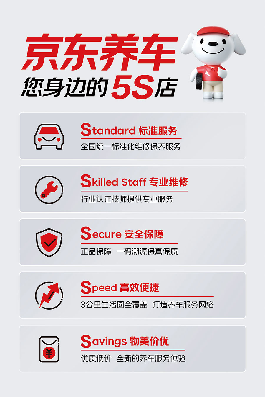 在養(yǎng)車標準方面京東養(yǎng)車秉承有保障、更專業(yè)的品牌服務理念,推出全新5S服務標準。從多個維度保障客戶權益,提升服務品質(zhì)。