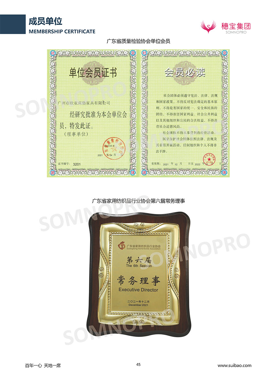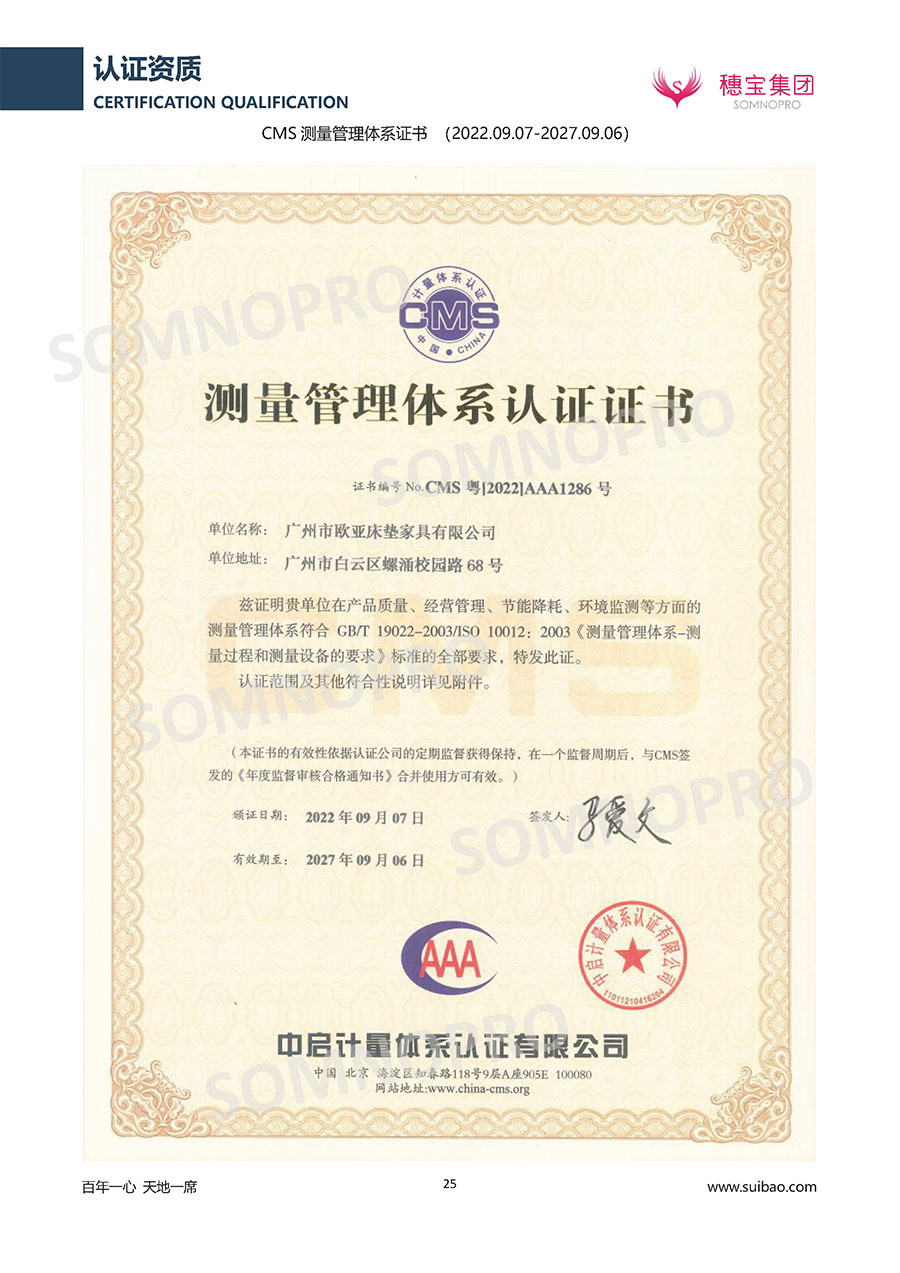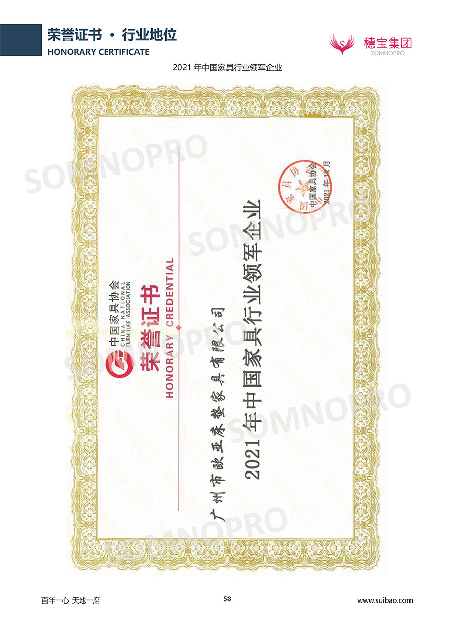 本著高品質(zhì)、高效率、重管理的原則,穗寶已通過(guò)ISO9001質(zhì)量管理體系認(rèn)證證書、ISO14001環(huán)境管理體系認(rèn)證證書、ISO45001職業(yè)健康安全管理體系認(rèn)證證書、中國(guó)環(huán)境標(biāo)志產(chǎn)品認(rèn)證證書、家居綠色環(huán)保領(lǐng)跑品牌、綠色正品家居品牌、企業(yè)標(biāo)準(zhǔn)“綠色領(lǐng)跑者”證書、CMS測(cè)量管理體系證書、CMS測(cè)量管理體系證書附件、廣東省“守信用重合同”企業(yè)、廣州歐亞-納稅信用A級(jí)納稅人(連續(xù)5年:2018-2022)、2024年中國(guó)500最具價(jià)值品牌,品牌價(jià)值高達(dá)302.89億元、廣東高價(jià)值商標(biāo)品牌(穗寶)、廣東省重點(diǎn)商標(biāo)保護(hù)名錄納入證明、廣州市勞動(dòng)關(guān)系和諧企業(yè)AA級(jí)。穗寶自創(chuàng)立以來(lái),不斷致力于新產(chǎn)品的設(shè)計(jì)與研發(fā),多次在國(guó)內(nèi)家具展會(huì)屢獲獎(jiǎng)項(xiàng),產(chǎn)品暢銷國(guó)內(nèi)外,深受客戶一致好評(píng)。