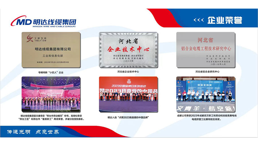 明達線纜先后被評為中國線纜企業(yè)百強、礦用橡套電纜企業(yè)十強、中國最具投標實力電線電纜供應商百強,國家高新技術企業(yè)、國家級專精特新小巨人企業(yè)、國家守合同重信用企業(yè)、全國質量誠信示范企業(yè)、點贊2023我喜愛的中國品牌、全國用戶滿意星級產品、河北省民營企業(yè)百強、河北省誠信企業(yè)、河北省產業(yè)集群龍頭企業(yè)、河北省企業(yè)技術中心、河北省制造業(yè)單項冠軍(鋁合金電纜)、河北省企業(yè)標準領跑者、河北省級標準化良好行為試點企業(yè)、河北省安全生產標準化企業(yè)、邢臺市政府質量獎、邢臺市智能電網及輸配電裝備產業(yè)鏈鏈主企業(yè)、邢臺市電線電纜協(xié)會會長單位等多項資質榮譽。