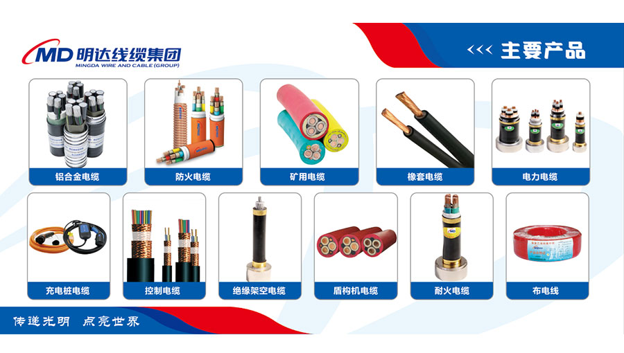 主要產品:“明達”牌鋁合金電纜、防火電纜、礦用電纜、橡套電纜、電力電纜、充電樁電纜及連接裝置、控制電纜、布電線、架空絕緣電纜、盾構機電纜、耐火電纜等線纜產品