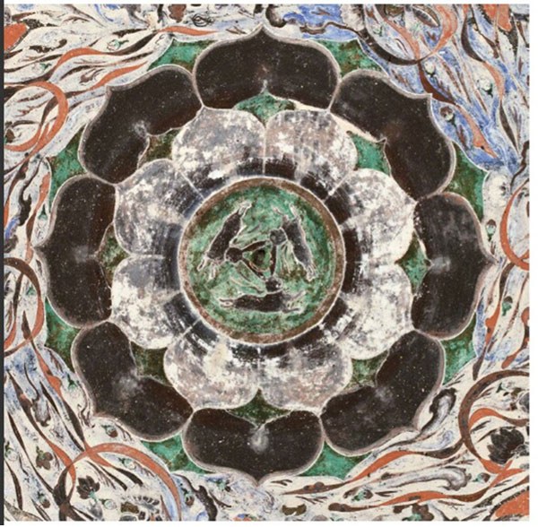 「三兔共耳」源于敦煌石窟第407窟頂中央藻井的“三兔聯(lián)跑蓮花紋”。在這個(gè)開鑿于隋代的洞窟中,窟頂中央繪制了數(shù)層八瓣大蓮花;周遭環(huán)繞著衣帶飄飄、手持花盤的飛天形象;蓮花中心則繪制了三只追逐奔跑的兔子。畫師以巧思將每只兔子二只耳朵中的一只重疊,看似三兔三耳,但以每只兔子各自的角度觀察,則雙耳俱全。三只兔耳組成等邊三角形,配合外圍的蓮瓣與飛天,不僅兔子奔跑跳躍的神態(tài)生動(dòng)逼真,整個(gè)藻井紋飾也都充滿了動(dòng)感!