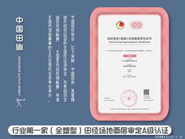 本次杰銳體育產(chǎn)品全塑型跑道進入A級產(chǎn)品序列,是中國田協(xié)對杰銳體育全塑型產(chǎn)品,產(chǎn)品品質(zhì)和產(chǎn)品競爭力的高度認可。值得一提的是,截止3月1日,杰銳體育是目前行業(yè)內(nèi)第一家獲得全塑型中國田協(xié)田徑場地面層審定認證A級的企業(yè),此外杰銳體育也是目前獲得中國田協(xié)田徑場地面層審定認證數(shù)量最多的企業(yè),同時也是世界田徑協(xié)會(World Athletics 縮稱WA)統(tǒng)計獲WA認證最多的企業(yè)。