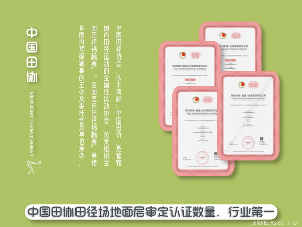中國田徑協(xié)會田徑場地(跑道)合成面層產(chǎn)品審定辦法,是為規(guī)范田徑場地合成面層產(chǎn)品使用,提高面層材料產(chǎn)品質(zhì)量、促進田徑場地建設(shè)質(zhì)量,滿足舉辦高水平田徑競賽及開展群眾性、學(xué)校內(nèi)田徑運動的需要,中國田徑協(xié)會(以下簡稱:中國田協(xié))參照世界田徑聯(lián)合會(以下簡稱:世界田聯(lián))認證體系,結(jié)合中國田徑場地發(fā)展現(xiàn)狀制定的。是國內(nèi)最具知名度和可靠性的行業(yè)評級體系之一,是各大運動地材企業(yè)的“兵家必爭之地”。