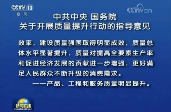 2017年9月5日,我國(guó)質(zhì)量發(fā)展史上首個(gè)以黨中央、國(guó)務(wù)院名義出臺(tái)的質(zhì)量工作綱領(lǐng)性文件——《中共中央國(guó)務(wù)院關(guān)于開展質(zhì)量提升行動(dòng)的指導(dǎo)意見》。