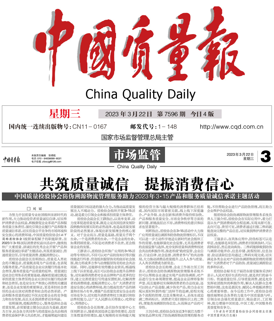 ——中國質(zhì)量檢驗協(xié)會防偽溯源物流管理服務(wù)助力2023年3·15產(chǎn)品和服務(wù)質(zhì)量誠信承諾主題活動