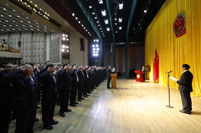 會(huì)議舉行了憲法宣誓儀式。下午3時(shí)30分,在張茅的監(jiān)誓下,馬正其宣布宣誓儀式開始??偩謾C(jī)關(guān)138名新任司局級(jí)干部集體列隊(duì),面向國徽、國旗,同唱中華人民共和國國歌。領(lǐng)誓人撫按憲法,宣讀誓言,其他宣誓人列隊(duì)站立,跟誦誓詞。