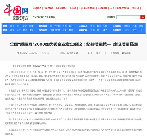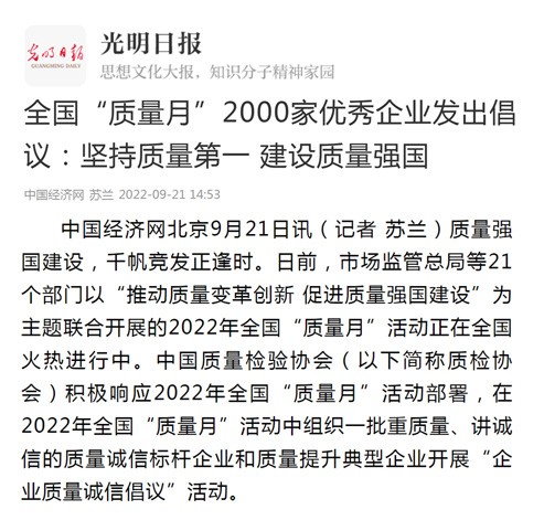 中國經(jīng)濟網(wǎng):全國“質量月”2000家優(yōu)秀企業(yè)發(fā)出倡議:堅持質量第一 建設質量強國