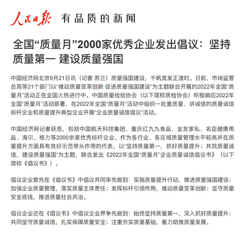 人民網(wǎng):全國“質量月”2000家優(yōu)秀企業(yè)發(fā)出倡議:堅持質量第一 建設質量強國