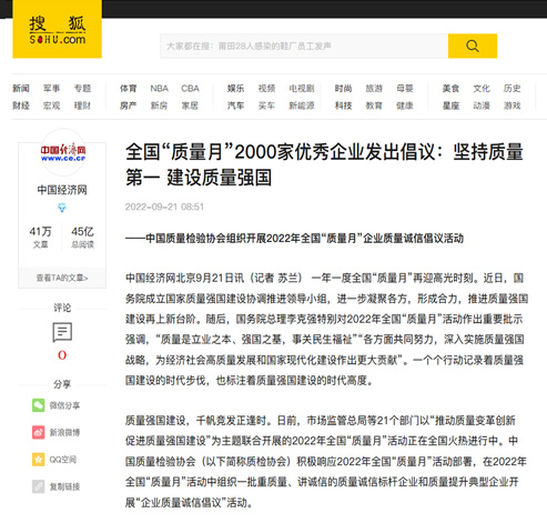 搜狐網(wǎng):全國“質量月”2000家優(yōu)秀企業(yè)發(fā)出倡議:堅持質量第一 建設質量強國
