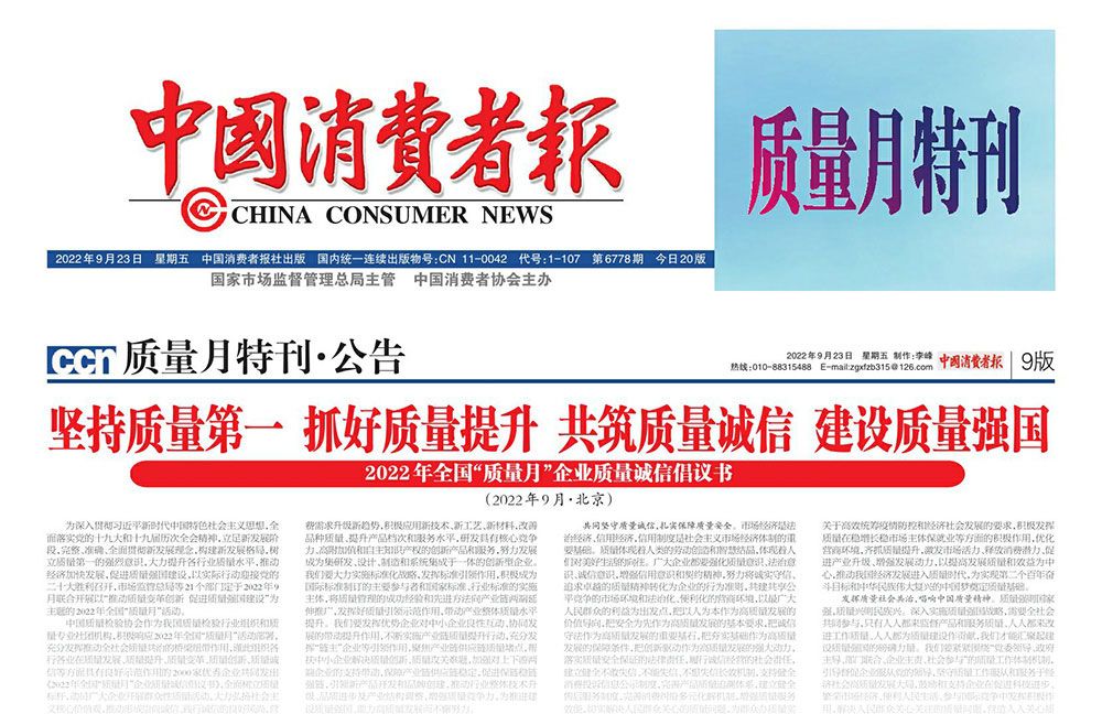 中國消費者報:堅持質量第一 抓好質量提升 共筑質量誠信 建設質量強國