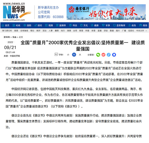 新華網(wǎng):全國“質量月”2000家優(yōu)秀企業(yè)發(fā)出倡議:堅持質量第一 建設質量強國
