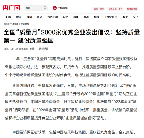 中央廣播電視總臺央廣網(wǎng):全國“質量月”2000家優(yōu)秀企業(yè)發(fā)出倡議:堅持質量第一 建設質量強國