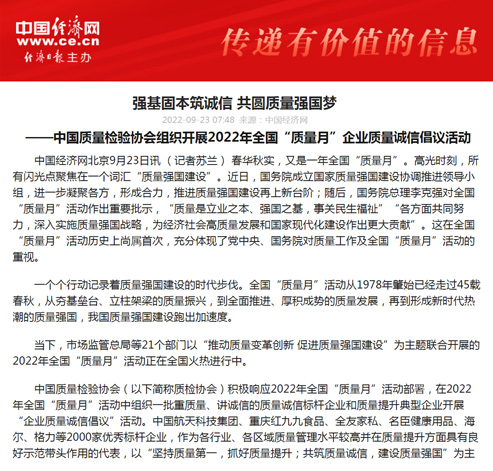中國經(jīng)濟網(wǎng):匯聚力量攜手抓好質量提升 肩負使命促進質量強國建設——2022年全國“質量月”企業(yè)質量誠信倡議活動綜述