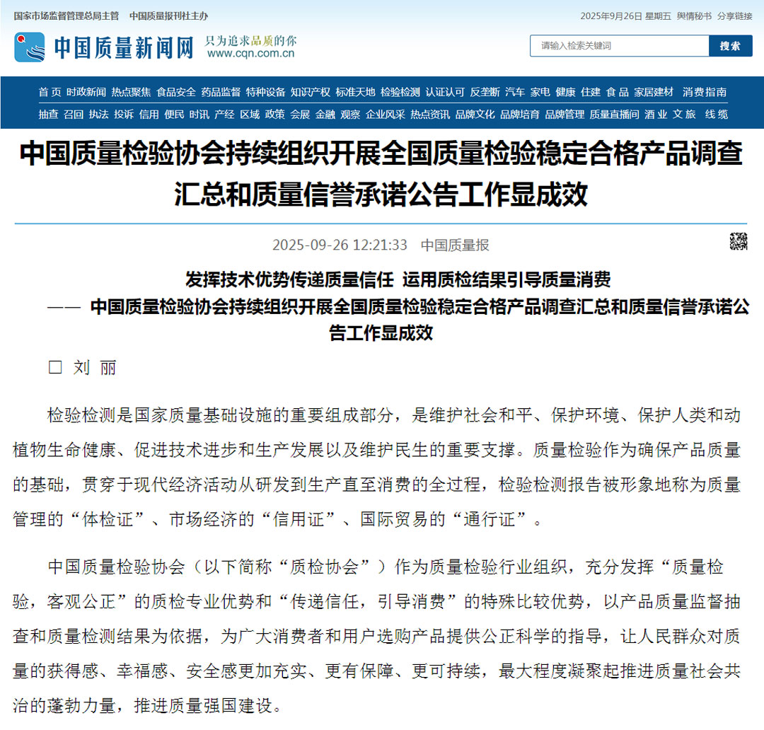 - 新華網(wǎng)報(bào)道——千家企業(yè)發(fā)出倡議:視質(zhì)量為生命 以高質(zhì)量為追求——中國(guó)質(zhì)量檢驗(yàn)協(xié)會(huì)組織開(kāi)展2025年全國(guó)“質(zhì)量月”企業(yè)質(zhì)量誠(chéng)信倡議活動(dòng)